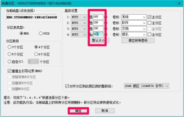 3、在快速分区窗口的高级设置下,可调整分区大小(或默认分区大小),调整后点击:确定;