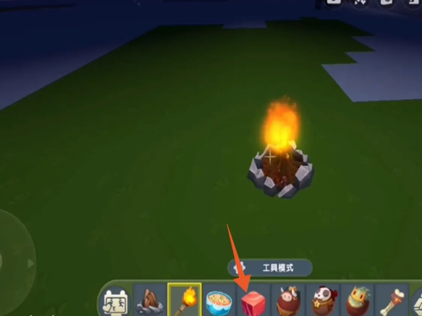 2、然后我们找一处位置将篝火点燃,接着把牛排放在篝火上烤。