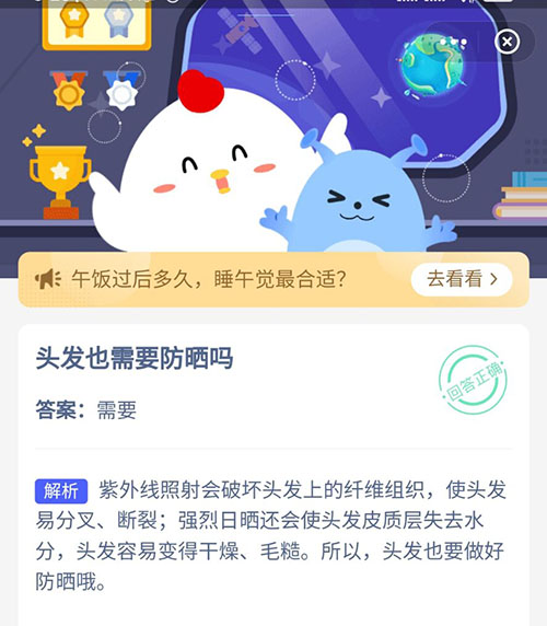 以上就是关于支付宝蚂蚁庄园中,头发也需要防晒吗?这个问题的正确答案,知道答案的小伙伴赶紧去领取属于自己的小鸡饲料吧,更多精彩内容沙包手游会持续为你更新。