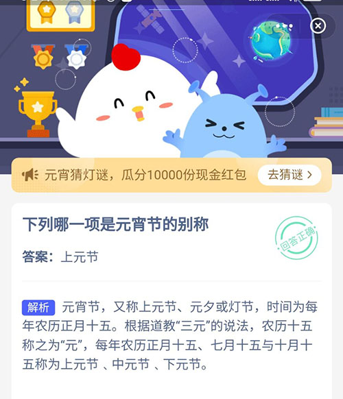 今天是正月十五元宵节,但是小伙伴们知道吗?关于元宵节还有其他的别称,今天的支付宝小鸡答题就问到大家这个问题,在下列选项中哪一个是元宵节的别称,不知道答案的小伙伴赶紧来看看吧。
