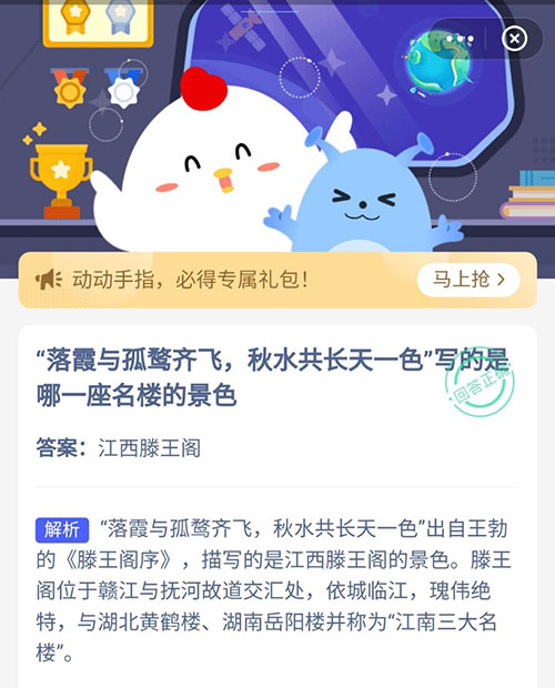 以上就是关于落霞与孤鹜齐飞,秋水共长天一色写的是哪一座名楼的景色?这个问题的正确答案,知道答案的小伙伴赶紧一起获取吧,明天的支付宝小鸡答题也会为你更新的哦,不要错过了。