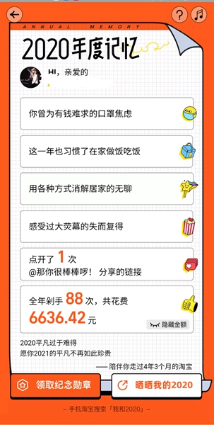 2020马上就要结束了,今年是特别的一年。感谢那些默默为我们付出的人。在进入新的一年之前很多小伙伴都想看看自己的淘宝年度账单,那么下面就让小编来告诉大家2020淘宝年度账单查看教程吧。