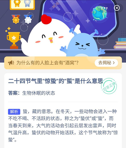 今天是二十四节气中的“惊蛰”,关于惊蛰小伙伴们又了解多少呢?今天的支付宝小鸡答题中就闻到大家这个问题,二十四节气里惊蛰的蛰是什么意思,不知道答案的小伙伴赶紧和小编一起看看正确答案吧。