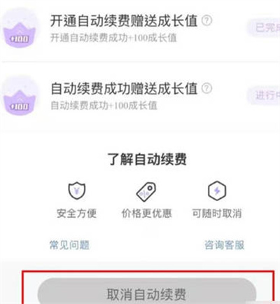 当我们进入管理自动续费之后,我们可以看到下面有一个取消自动续费的功能,点击即可取消自动续费了。