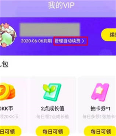 进入快看vip页面之后,我们在自己的信息下面可以看到一个管理自动续费的功能。