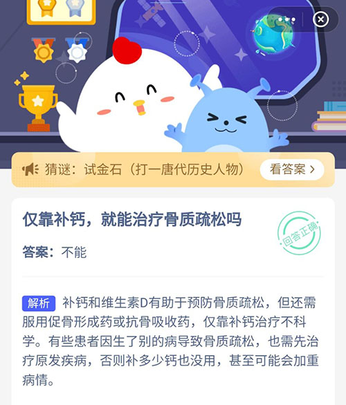 以上就是关于仅靠补钙,就能治疗骨质疏松吗这个问题的具正确答案,获取到正确答案的小伙伴不要错过了,沙包手游会持续为你更新,每天的支付宝蚂蚁庄园正确答案第一时间为你提供,一定不要错过了哦。