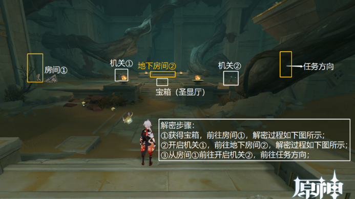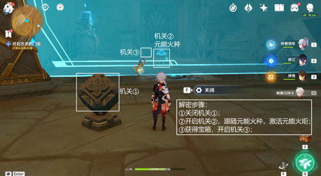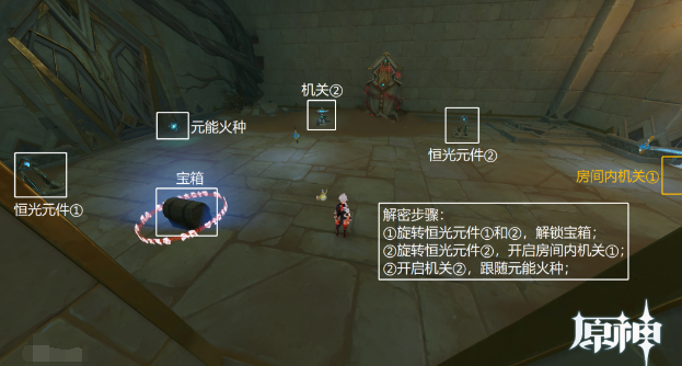 19、继续跟随元能火种,按图中解密步骤,前往房间①。