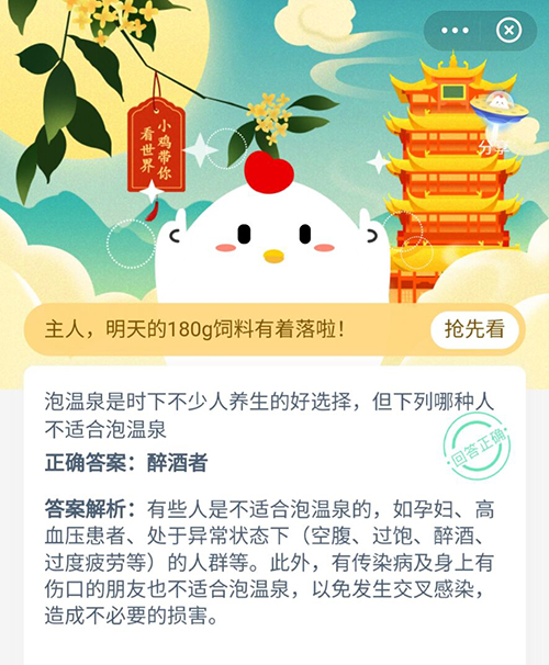 随着冬天的来临,有超多伙伴都喜欢上了泡温泉,在今天的支付宝小鸡答题中就会就问到大家这个问题,有一些人是不能泡温泉的哦,小伙伴们知道是哪些人吗,下面一起来和小编看看正确答案吧。