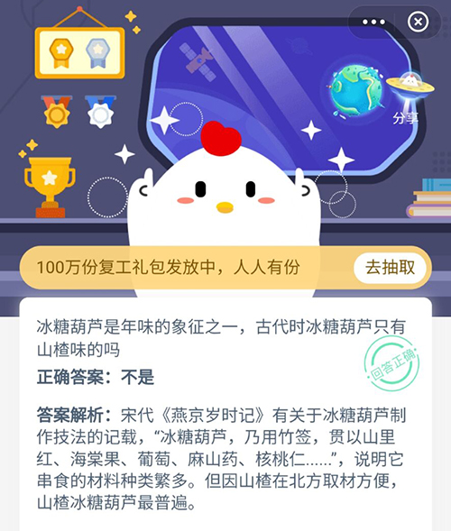 过年的时候都会吃糖葫芦,冰糖葫芦同时也是年味的象征之一,但是小伙伴们知道吗?古代时候的糖葫芦是真的只有山楂味道吗?今天的支付宝小鸡答题就问到大家这个问题,赶紧一起来看看正确答案吧。