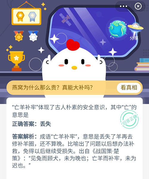 亡羊补牢这个成语加上寓言故事,相信有超多小伙伴知道故事内容,今天的支付宝小鸡答题就问到小伙伴这样一个问题。亡羊补牢中的亡原来是什么意思?不知道的小伙伴赶紧一起看看正确答案吧。