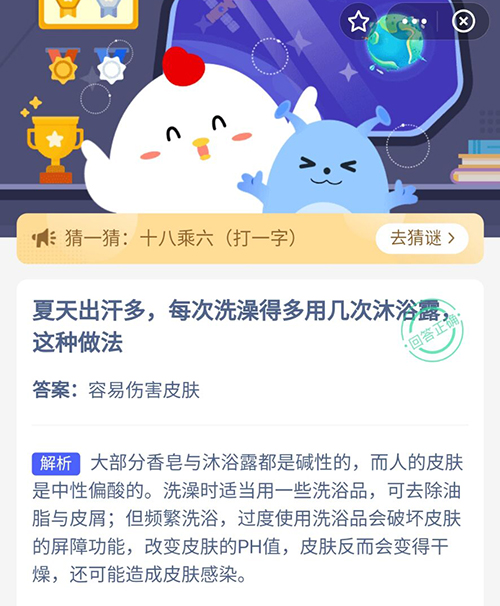 在夏天的时候,出汗多是非常常见的一件事情,但是在每一次洗澡的时候多用几次沐浴露,这种做法是正确的还是错误的,在今天的支付宝蚂蚁庄园小鸡答题中,关于这个问题的正确的答案,想知道正确答案的小伙伴一起来看看吧。