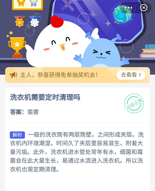 关于洗衣机清理的问题和方法,小伙伴们知道多少呢?今天蚂蚁庄园中的问题就是:洗衣机需要定时清理吗?想知道正确答案的小伙伴赶紧一起来看看吧,答对就可以领取属于自己的小鸡饲料了。