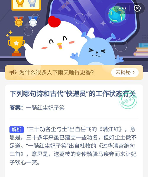 今天的支付宝小鸡答题中出现两句诗词,那么下列哪句诗和古代快递员的工作状态有关?是“一骑红尘妃子笑”还是“三十功名尘与土”?不知道答案的小伙伴们赶紧和小编一起来看看吧,答对就可以领取属于自己的小鸡饲料哦。