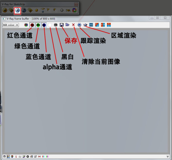 第三个是启动渲染的按钮,当点击后会先卡一阵子(具体时间要看场景的复杂程度和电脑的配置好坏)。 图中的区域渲染用于图片的局部渲染,当调整参数测试场景的时候,有时只需观察图中的某个部分,若整个画面渲染便会浪费时间,此时只需点击区域渲染的按钮,框选需要观察的部分再进行渲染即可。至于右边的几个按钮,本来是用于多个渲染结果的比较,但是却少了一个至关重要的按钮,这个按钮在最新版的vray for su 1.6中能正常使用,至于1.5版本我实在没搞懂怎么用,可以忽略。