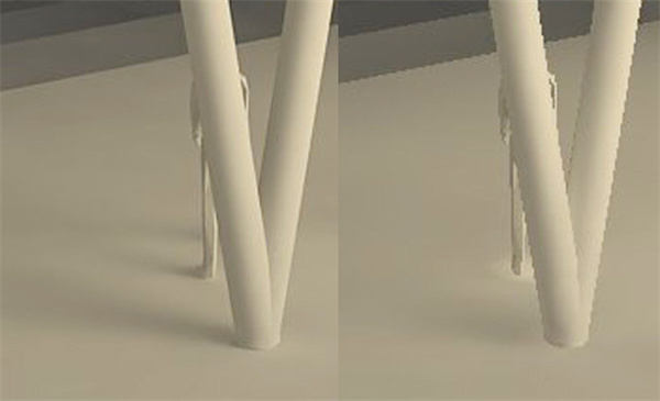 通过放大,可以看到左图(高)的阴影细节和画面平滑程度都要比右图优秀。【主要影响间接光照所产生的阴影】