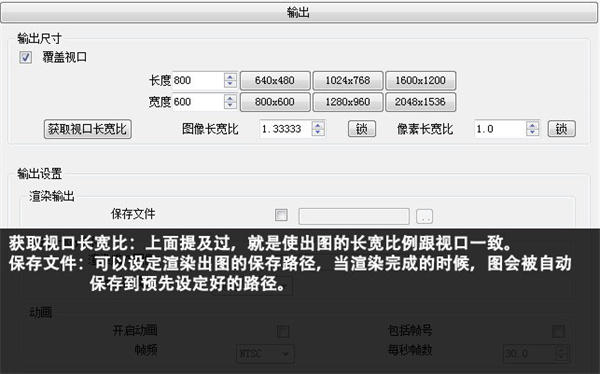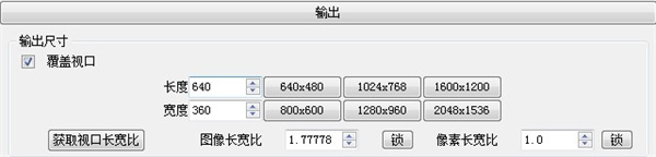 输出【渲染出图的分辨率大小,越大耗费时间越长,测试的时候当然调小点,一般640*360,或者根据实际需要调整,“获取视口长宽比”可以获取su模型视口的长宽比例,出图的时候能包含画面的全部内容(请看第二三张图)】