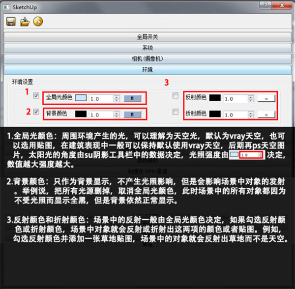 第二个是vray的参数面板,用于调试渲染的环境、间接光等参数,往后会展开说明。其中标记的项是一般需要调整的项,其它一般可以保持默认。