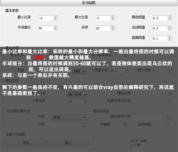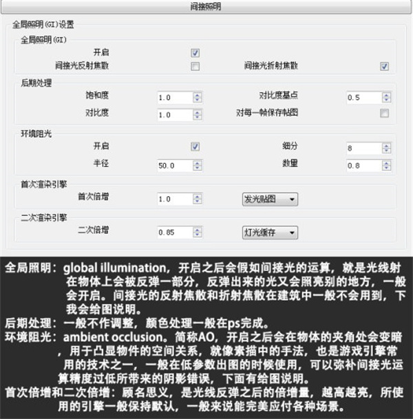 总结:测试渲染的时候使用以上给出的低参数,而渲染最终图的时候再在给出的低参数的基础上将参数调高,根据自己需要来改变数值,以节省时间同时获得最佳效果(PS:数值越大不一定代表精细度越高!请认真观看参数的详解部分)。其他没有提及的参数不需要大家研究,一般不会在做现阶段建筑效果图中用到,但是有兴趣的同学可以交流一下。专业人士请勿嫌弃本教程,毕竟这是针对基础较薄弱的同学。