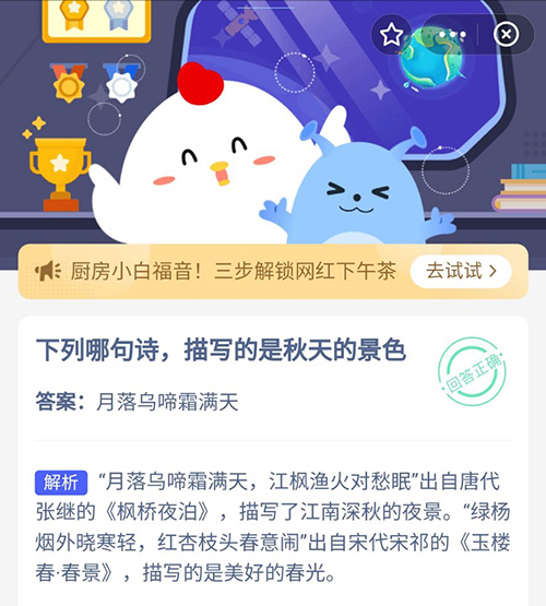 秋天是拥有精彩景色最多的一个天气,在下列哪句诗中,描写的是秋天的景色?今天的支付宝蚂蚁庄园中,“月落乌啼霜满天”和“绿杨烟外晓寒轻”那一句诗句描写的是秋天,想知道蚂蚁庄园11月2日的正确答案,赶紧和小编一起来看看吧。