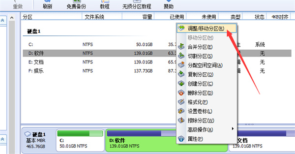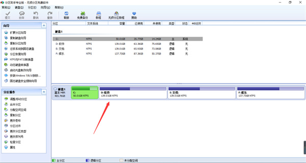 1、首先大家可以在上面下载分区助手软件,安装完成后打开分区助手,可以看到电脑硬盘的使用和分区情况,我们可以看到相邻的D盘是有多余空间可以用来分配给C盘的。