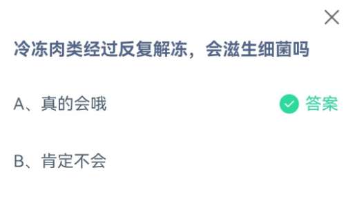 支付宝2023蚂蚁庄园7月12日答案最新,2023支付宝蚂蚁庄园7月12日的题目已经更新了,今天的题目为:冷冻肉类经过反复解冻会滋生细菌吗?正确答案是什么,可能很多小伙伴可能还不太清楚。接下来计入小编来为大家解答一下吧。