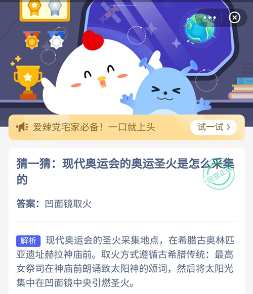 以上就是关于猜一猜现代奥运会的奥运圣火是怎么采集的?这个问题的正确答案,获取到正确答案的小伙伴们,赶紧去领取自己的小鸡饲料。