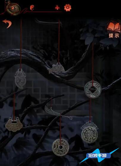2、回到庭院点击树上的纸币,按下图完成调整获得发条钥匙。