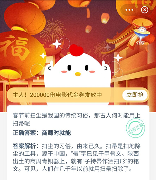 以上就是关于春节前扫尘是我国的传统习俗,那古人何时能用上扫帚呢?这个问题的正确答案,不仅可以为小伙伴们带来更多知识,还可以知道一些历史常识,知道答案的小伙伴赶紧去获取属于自己的奖励哦。