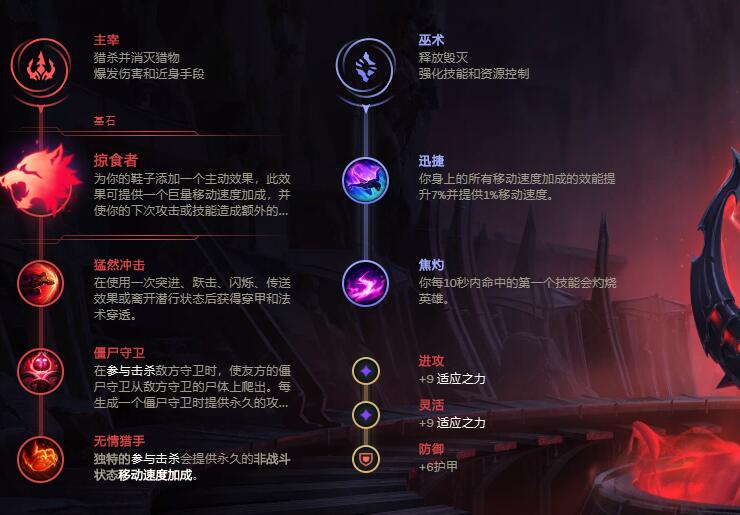 (1)主系符文:主宰+掠夺者+猛然冲击+僵尸守卫+无情猎手;