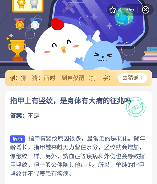 在人体的指甲上有一种竖纹,指甲中出现竖纹,是不是代表身体有大病,在今天的支付宝小鸡答题中,指甲有竖纹是有大病的征兆吗?赶紧和小编看看支付宝蚂蚁庄园中11月5日的正确答案吧。