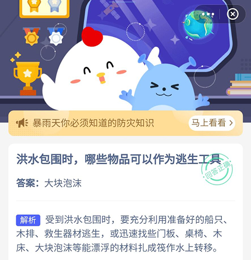 以上就是关于洪水包围时哪些物品可以作为逃生工具?这个问题的正确答案,获取正确答案的小伙伴赶紧去领取自己的小鸡饲料吧。