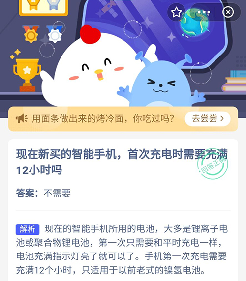 生活中购买新手机之后, 需要首次充电充满12个小时吗?在今天支付宝蚂蚁庄园中,关于新手机是否需要充满12个小时的问题,想知道正确答案的小伙伴们,赶紧和小编一起来看看正确答案吧。