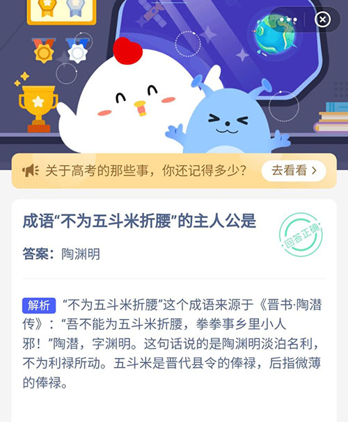 以上就是关于成语“不为五斗米折腰”的主人公是?这个问题的正确答案,明天的支付宝蚂蚁庄园中的正确答案也会持续为用户更新的哦,赶紧去领取属于自己的小鸡饲料吧。
