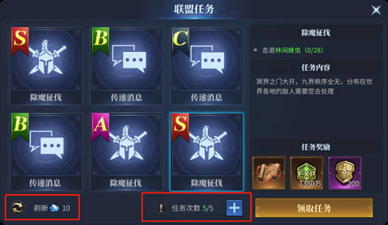 三、任务详情1、联盟任务按难度可分为S、A、B、C级,完成难度越高的任务可获得更丰富的奖励。每日有5次免费任务次数,任务次数可额外进行购买。每日有5次免费刷新次数,刷新可将6个联盟任务重新随机,刷新次数可额外进行购买。
