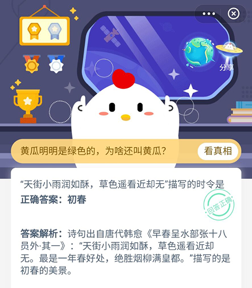 以上就是关于“天街小雨润如酥,草色遥看近却无"描写的时令是?这个问题的答案,也是支付宝小鸡宝宝考考你2月19日的正确答案,知道答案的小伙伴赶紧去领取属于自己的小鸡饲料吧。