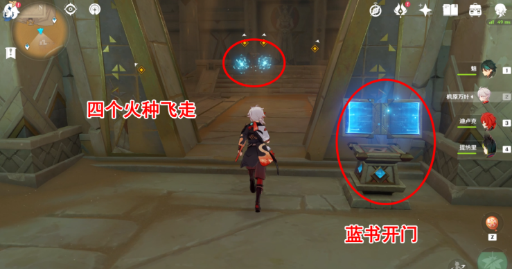 5、接着看到一本蓝书,交互后打开大门,看到四个元能火种飞出来,还有个华丽宝箱,先不管宝箱。