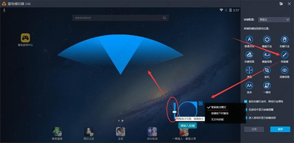 用于王者荣耀等类型的游戏方向技能;选了只能施法之后 按下技能键时出现技能施法范围 用鼠标选择方向,松开技能键释放技能。 另外可以调整施法范围,提高命中率。
