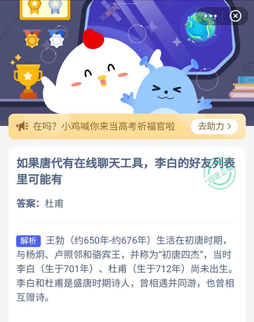 如果在唐代的时候,出现在线的聊天工具,你觉得李白的好友列表里面可能会有谁?今天支付宝蚂蚁庄园小鸡答题题目,关于蚂蚁庄园5月24号的正确答案,你觉得好友里面会有谁?一起看看正确答案吧。