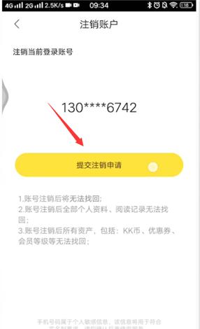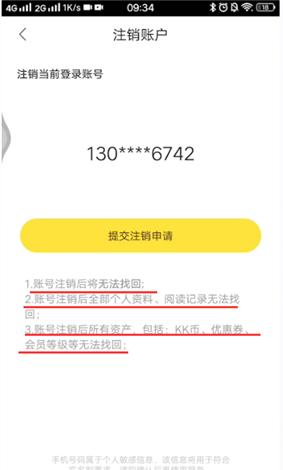 需要注意的是账号注销后将无法找回,全部个人资料,阅读记录也无法找回,所以资产包括kk币、优惠券、会员等级等也无法找回,