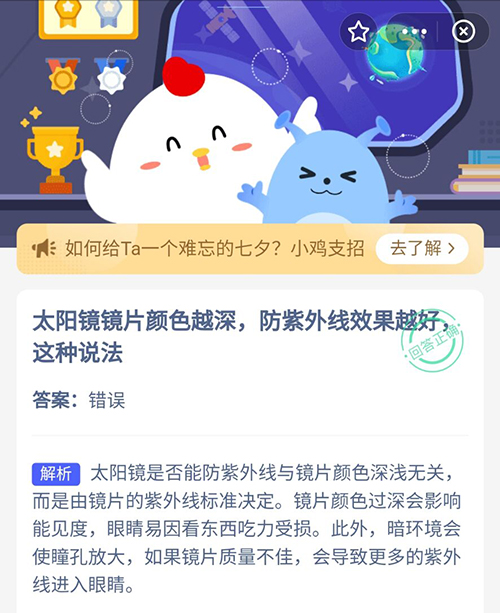 或许在小伙伴们的认知中,太阳镜镜片颜色越深,防紫外线效果越好这种说法是正确的还是错误的?在今天的支付宝蚂蚁庄园中,关于颜色越深防晒效果越强的问题,想知道正确答案的小伙伴赶紧来一起看看吧。