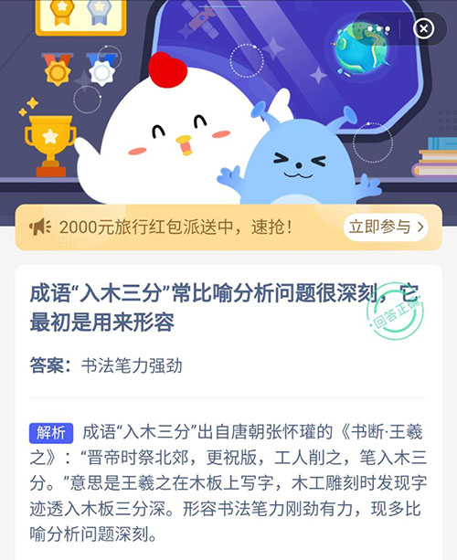 关于成语“入木三分”最常见比喻分析问题很深刻,但是它最初是用来形容什么的呢?支付宝蚂蚁庄园中小鸡答题就问到大家这个问题,有些小伙伴还不知道正确答案是什么,今天就和小编一起来看看吧,答对就可以领取小鸡饲料了哦。