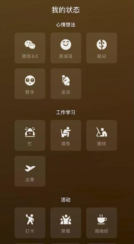 点击我-微信号下方新增状态栏,可以编辑个人状态。状态具体分为三大类:心情想法、工作学习、活动。状态可以真实展示使用人当前的情况,比如设置为“在忙”“摸鱼”等。同样设置“在忙”的人还可以看到共同好友的状态。