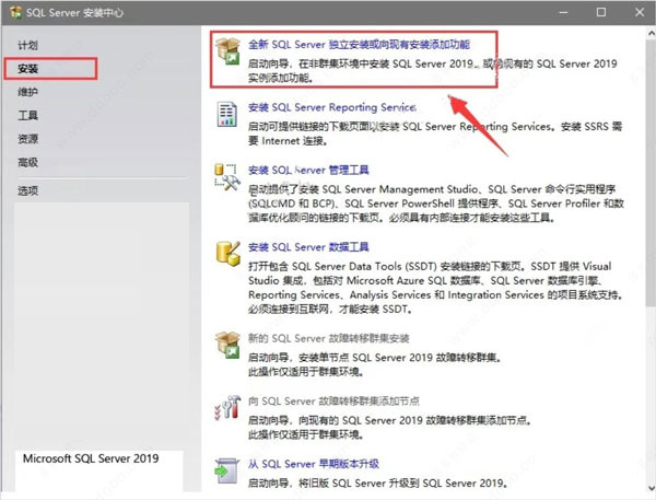 3、在软件的欢迎安装界面中,直接在界面左侧单击安装,然后直接单击选择【全新SQL Server独立安装或向现有安装添加功能】