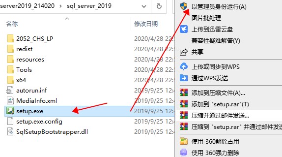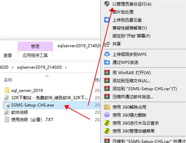 16、然后再次返回一开始解压的文件夹,找到并选中 【SSMS-Setup-CHS.exe】可执行文件,单击鼠标右键选择以【管理员身份运行】