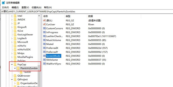2、在注册表编辑器中依次找到“HKEY_CURRENT_USERSoftwarePopCapPlantsVsZombies”