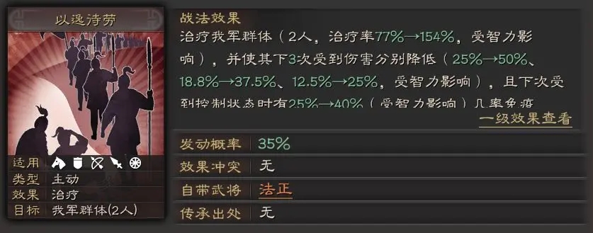 法正身为主将,定位就是纯辅助,负责治疗和解控,法正的自带战法以逸待劳可以享受到三势阵的发动加成,给队伍提供部分减伤+免疫控制的效果,同时大大提高整个队伍的生存和输出环境。另外选择三势阵和御敌屏障,也是增强队伍的稳定性和减伤。