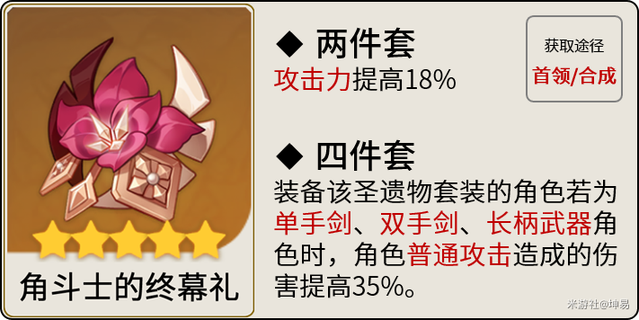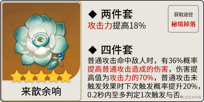 优点:稳定的普攻增伤,最好毕业的圣遗物,合成、首领、周本都能获得。