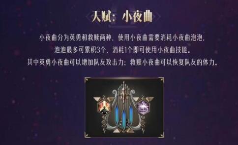 2、吟游诗人的天赋小夜曲分为英勇和救赎,英勇小夜曲可以给队友增加伤害,救赎小夜曲可以回复队友的血量。