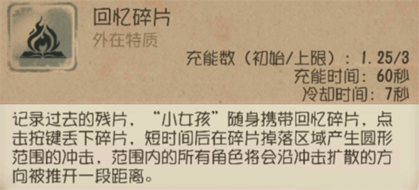 【回忆碎片】是以扔出碎片的位置为中心产生圆形范围的冲击,当监管者距离较近时使用【回忆碎片】并往反方向移动,可以与监管者拉开更远的距离。