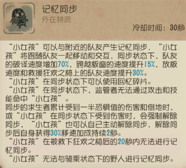 “小女孩”使用【记忆同步】可以辅助队友牵制,可以选择携带【化险为夷】分担救人位的救援压力,由于本身“小女孩”的牵制能力有限,因此携带【膝跳反射】可以增强自身的牵制能力。
